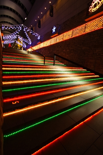 クリスマスカラーの階段が印象的。