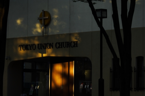 教会にちょうど木漏れ日が差していました。