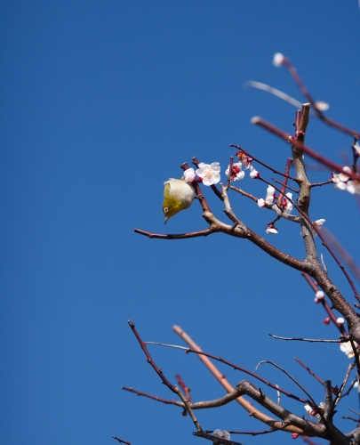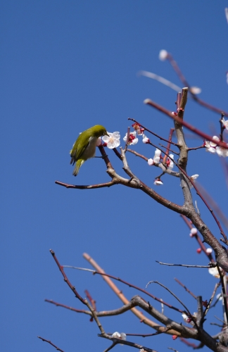 写真は梅の花の蜜を吸う「めじろ」さんです。