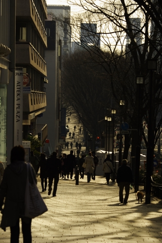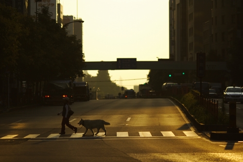 こんなビル街を犬と一緒に散歩する光景は