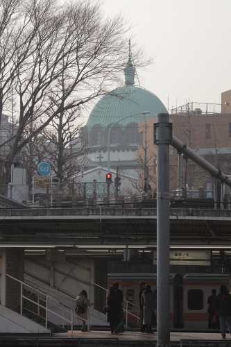 ホーム越しに見えるニコライ堂。